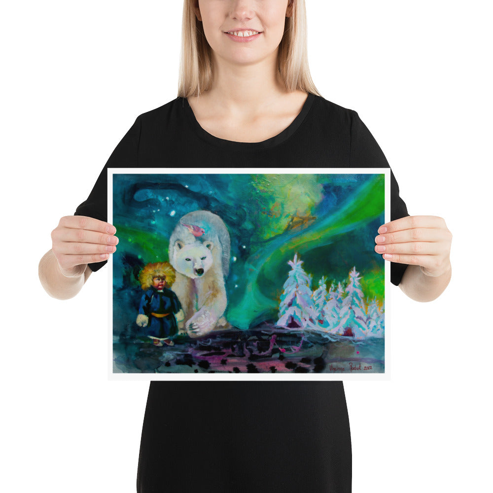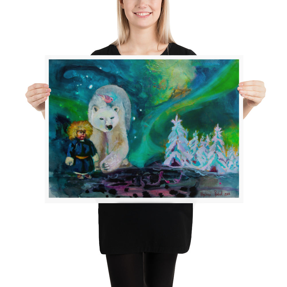 "Veille sur tes rêves" est le titre de cette affiche murale. Cette affiche a été créée avec l'intention suivante : " La magie du ciel illuminé la nuit, le silence de la forêt et les couleurs du ciel, tout est possible !"